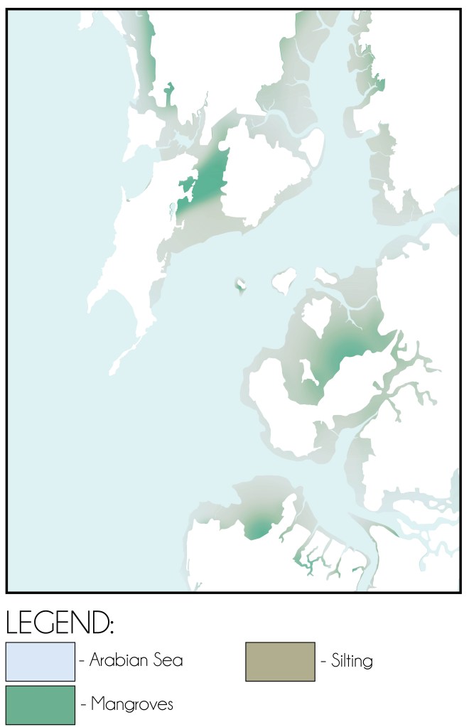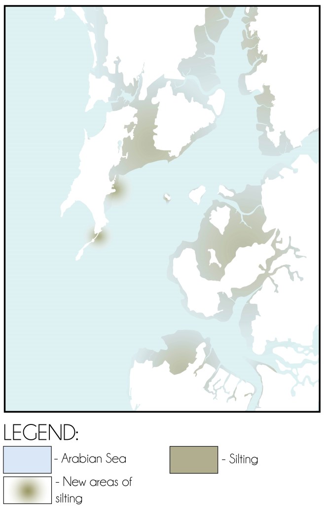 However, since proximal and sea-front zones of mudflats and swamps increased the percentage of silt arrested by mangroves reduced which led to the formation of large stretches of mudflats with unchecked silt. During low tide this unchecked silt would flow with the ebb current and get deposited on the sea bed following the natural slope thereby catalysing the process of silting in the Mumbai Harbour.