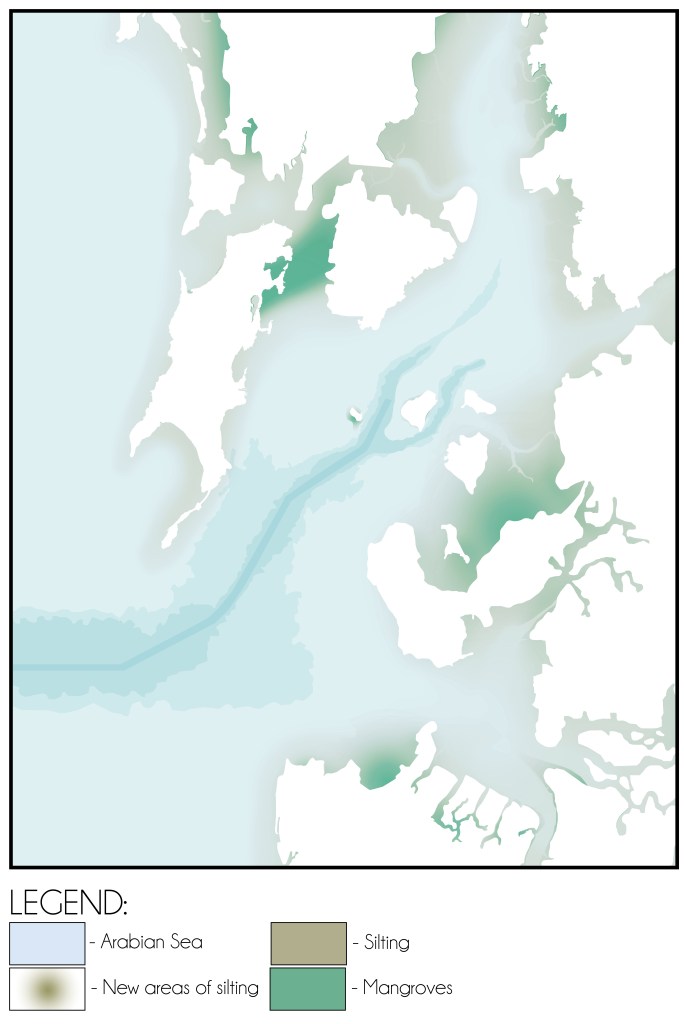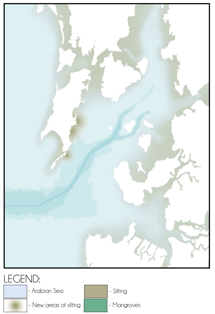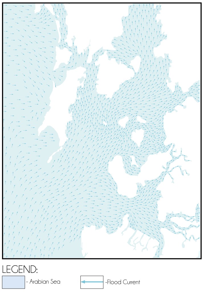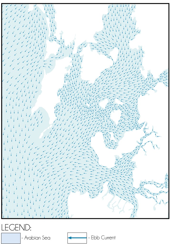 Fig. 02 and Fig. 03 indicate the flood current and ebb current dynamics in the Mumbai Harbour. Previously, silt carried by flood currents would settle along the gradual slopes, arrested by vegetation. Following the construction, sediment was no longer trapped along the shoreline but began migrated into the deeper harbour regions.